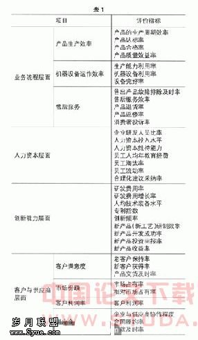 根据企业价值链和评价原则的分析,作为企业整体业绩评价的手段和企业价值创造过程的管理工具,基于价值链的企业业绩评价可从内部业务流程、人力资本、创新精神、客户和供应商四个层面来设置评价指标,具体评价指标见表1。