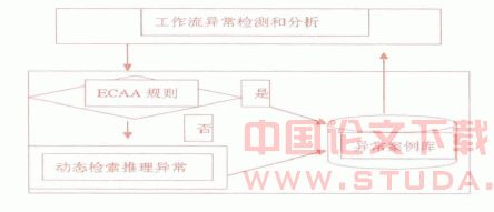 以专家门诊系统为例,假设,当用户向系统中输入某种病所表现出的症状时,得不到用药指导记录,这时系统抛出异常。该异常属于预测类的异常,通过判断异常分类机制直接去调用异常案例库中的异常即可,此时可以从案例库中得到疑似病例的案例;但是当发生非预测类的异常时,则要执行动态检索推理异常模块,从异常结构中抽象出异常的相关信息,然后检索案例库,找到类似的案例后,分析类似案例的解决办法,并从中派生出异常的处理方法和新案例,最后把动态产生新案例存放到案例库并使用派生的异常处理方法处理异常。在此过程中可以有人工参与,通过人机交互来处理非预测类异常。在判断之前,加上与规则对应的异常事件集,将规则引入异常流程的定义,并且在异常角色标识内部引入规则的编号。