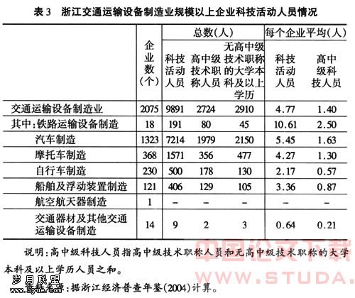 首先,企业科技活动人员特别是其中的高中级科技人员极度匮乏。表3的数据表明,浙江交通运输设备制造业规模以上企业的科技活动人员特别是其中的高中级科技人员极其匮乏。从规模以上企业总体看,2075家企业总共拥有的科技活动人员数为9891人,平均每家企业只有4.77人,其中高中级科技人员仅有1.40人。从汽车制造业看,1323家规模以上企业总共拥有科技活动人员7214人,平均每家企业只有5.45人,其中高中级科技人员仅有1.63人。科技人员特别是其中的高中级科技人员的匮乏限制了企业自主创新能力的提升,已成为当前制约浙江交通运输设备制造业产品换代和产业升级的一个重大瓶颈。