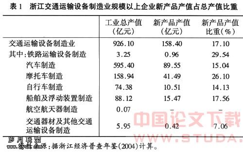从规模以上企业新产品产值占总产值的比重这一反映企业新产品开发情况的指标看,浙江交通运输设备制造业这一比重只有17.10%,特别是其中的汽车制造、自行车制造这一比重分别仅为15.04和14.13%(见表1),这表明浙江汽车和自行车制造业的新产品开发力度相对不足。