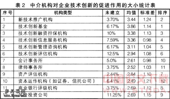 统计结果表明,多数企业认为对技术创新的促进作用大的中介机构排在前5位的是:技术创新基金、新技术推广机构、技术创新融资担保机构、技术创新信息服务机构、技术创新管理咨询机构。这些都充分说明,企业迫切需要技术创新资金中介、新技术中介以及信息与管理方面的中介支持。