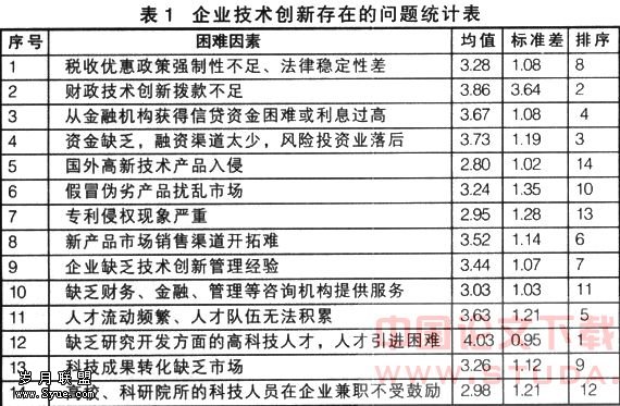从企业技术创新的理论分析出发,笔者列举了欠发达地区企业14项常见的困难因素,然后将困难程度与采取5分制的分值相对应, 5表示困难程度最高,0表示没有这项困难,让企业分别针对本企业技术创新的实际状况进行判断,统计结果如表1所示。
