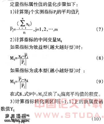 从上述转换可以看出,对于效益型指标来说.当实测值Xij大于平均值时,转换后其隶属度函数值大于0,实测值越大,隶属度函数值越大,当原始值达到一定数值时,隶属度函数值接近“饱和”。这样处理是为了防止某一指标隶属度函数值过大,从而影响整个综合指标。对于成本型指标,当Xii,越大,隶属度函数值反而越小,取负值;Xii越小,其隶属度函数值越大,取正值。