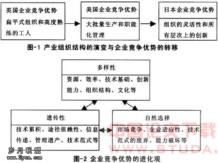 从上面的分析可以看出,企业能力理论与学理论有着密切的联系,它的产生在很大程度上依赖于各类经济学理论,如进化经济学、产业组织经济学、芝加哥产业经济学、奥地利学派等。尽管各类经济学在战略规划研究中能够推动有关方面的深入进行,为战略研究提供语义清晰、表述明确的理论,但它们之间由于以不同的方式和途径进行重点分析而产生很大的分歧。不过,与其他经济学派相比,进化经济学对有关企业动态成长的研究给予了充分的重视,明显地更关心技术变化和技术开发过程(Dosi,1988),因此它更适用于理解企业如何保持持续竞争优势的问题。进化论观点认为企业不再是传统理论中的“完全的理性决策者”,相反,企业被视为“适应性制度安排”,且由市场力量决定其形态。这样,市场被看作是一种选择机制,并通过不同的生存进程确保效率相对较高的企业继续生存。可以用图-2来清楚地显示企业的进化机制对持续竞争优势的影响。