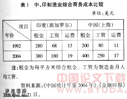 制造业产品的成本中,30%—40%由商务成本组成,它包括各类商务办公成本、运输检验费用、劳动力工资开销。其中最主要的是:工资、场地租金、运输检验费用。以下是对不同年份中、印两国制造业商务成本的比较: