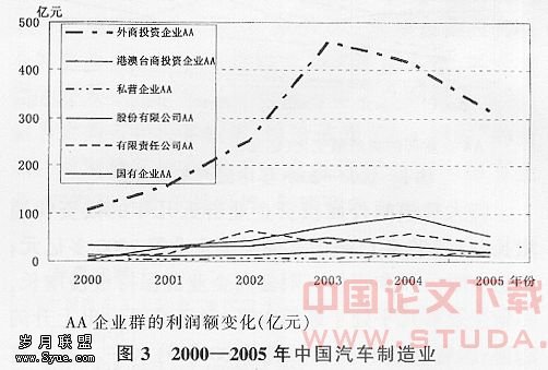 我国汽车制造企业群的利润额整体上在加入WTO之后的两三年一直在升温,是汽车行业盈利空间较大的时期,然而这些利润基本属于特大规模的外商投资企业群,这一群体利用自身的优势,抓住生产市场,占领消费市场,实现较大的盈利水平;目前,股份有限公司和有限责任公司企业群的利润额约是外商投资企业的1/6,其他类型的企业群的利润额更少。
