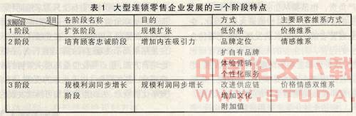 由于市场竞争激烈,零售商必须在留住老顾客的同时不断进行扩张,这就要求企业必须两条腿走路,一是通过不断降低产品成本和产品价格吸引更多的顾客,扩大市场规模,二是通过提高企业及品牌的心理、情感和文化附加值的方法,维系和稳定现有顾客,巩固已有的市场规模,即与顾客的两种维系协调平衡,同步发展,从而实现一种新的良性互动,即一方面以规模销售去获得供应商更低的价格,并通过扩大自有品牌进一步降低成本,实现更大的销售规模;另一方面以品牌和服务为中心,以文化为纽带,通过各种情感、心理的沟通与联系,去巩固和稳定原有市场和顾客,从而形成价格维系和情感维系同步,市场开发与巩固并举,形成一种较理想的发展局面。这三种发展阶段如表1所示。