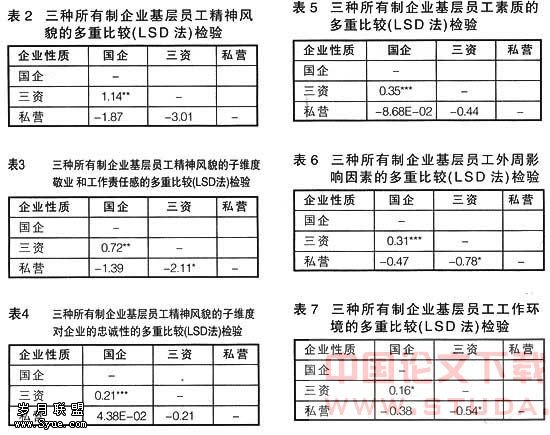 从表2至7的结果可以看出:在企业的基层员工精神风貌方面,三资企业与国有企业存在较为显著的差异(1.14**,见表2),这一较为显著差异反应在其子维度基层员工敬业和工作责任感(0.72**,见表3)及对企业的忠诚度(0.21***,见表4),同时,三资企业与私营企业在企业的基层员工精神风貌方面存在显著差异(-3.01*,见表2),这一差异反应在其子维度基层员工敬业和工作责任感(-2.11*,见表3);在基层员工的素质方面,三资企业与国有企业存在非常显著差异(0.35***,见表5);在基层员工的外周影响因素方面,三资企业与国有企业存在非常显著差异(0.31***,见表6),三资企业与私营企业存在显著差异(-0.78*,见表6);在基层员工工作环境方面,三资企业与国有企业存在显著差异(0.16*,见表7),三资企业与私营企业存在显著差异(-0.54*,见表7)。这三种不同所有制企业在表2-表7其它维度或子维度上均无显著差异。