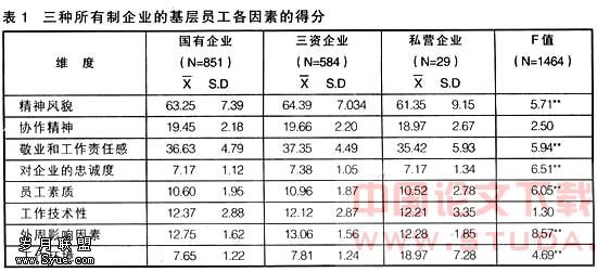 综上所述,在企业的基层员工方面三资企业与国有企业存在显著差异,这一差异反应在基层员工精神风貌(这一较为显著差异反应在其子维度基层员工敬业和工作责任感及对企业的忠诚度)、素质上、外周影响因素上;三资企业与私营企业存在显著差异,这一差异反应在基层员工精神风貌(这一差异反应在其子维度基层员工敬业和工作责任感)和外周影响因素上;国有企业与私营企业无显著差异。