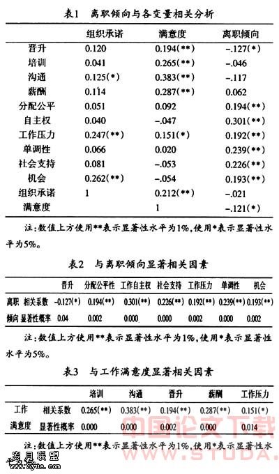 相关分析是指两类现象在发展变化的方向与大小方面存在一定的关系,反映了变化之间联系的紧密程度。为了探讨影响员工流失的各因素与工作满意度、组织承诺及离职倾向的关系,我们对各因素进行相关分析,分析结果参见表1。