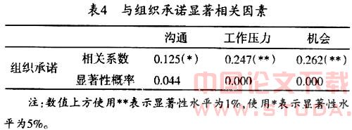 由表4可知,组织承诺与沟通在0.05水平上显著相关,与工作压力和外部工作机会在0.01水平上显著相关。与其他变量如培训、薪酬、晋升相关性不明显。