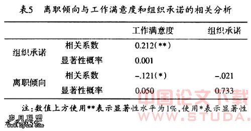 表5说明了在离职倾向和组织满意度两个因素对离职倾向的影响中,工作满意度最为显著,在0.05水平上显著相关。工作满意度和组织承诺在0.01水平上显著相关。