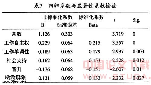 相关分析可以说明各因素之间是否存在关系以及关系的紧密程度与方向,回归分析则可进一步指明关系的方向,可以说明因素之间是否存在因果关系,本部分采用多元线性回归分析,将离职倾向作为因变量,将工作自主权、单调性、社会支持、晋升、工作压力为自变量进行逐步回归,对其因果关系进行验证。