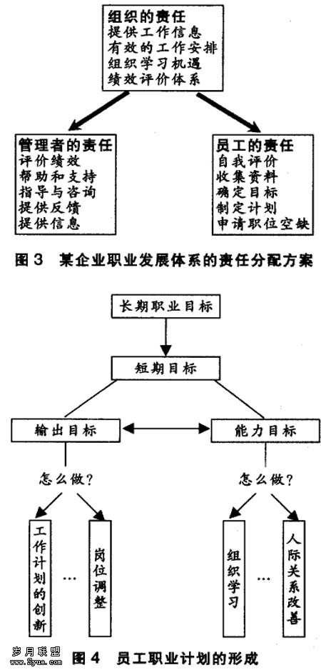 由上面的分析可以看到,一项成功的职业计划是组织、员工的直接主管以及员工个人三者协同努力的结果。其中:计划由员工制定,其直接主管给予指导和激励,而组织提供必要的资源和有利的环境。图3显示了某的职业发展体系责任分配方案。