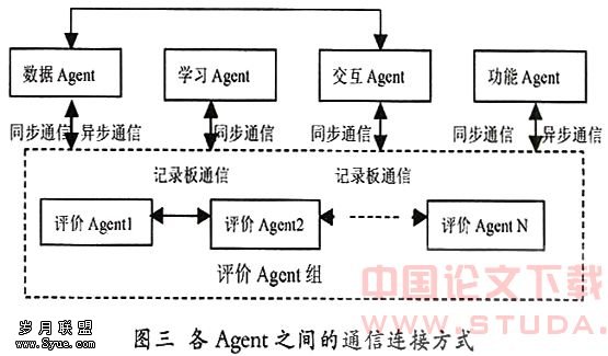 实现各个Agent间的信息有效传递是确保供应链评价系统模型有效运作的重要环节,Agent之间的信息传递由功能Agent完成。供应链评价系统信息传递中需要信息共享、同步信息传递、异步信息传递。信息传递一是通过记录板方式,即:Agent把信息存放在其它Agent能存取的记录板上,实现信息共享;二是把信息在两个Agent之间的直接传递实现信息的同步传递;三是由Agent之间将信息存放在事先约定的地方,信息存取在不同时间完成信息的异步通信。本模型所采用的Agent之间的通信连接方式如图三所示。