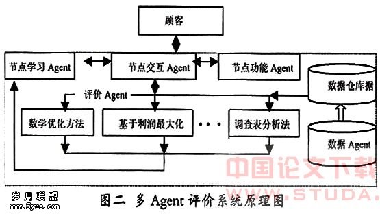 在供应链上应用基于多Agent系统的评价原理进行系统评价时首先应确定节点核心。其次以核心节点为中心的供应链评价从本质上应反映供应链整体绩效目标的耦合程度。核心节点的Agent对供应链其他节点的评价所需数据和评价完成结果通过internet实施调用。具体运作过程如下:(1)核心节点的交互Agent接受顾客的评价要求和有关数据后,通过功能Agent向评价Agent进行查询,征求评价Agent的评价能力后,将评价任务分解后转送给评价Agent进行评价。(2)核心节点评价Agent组接受来自功能Agent要求的评价任务后,根据需要通过数据仓库采集数据Agent中的数据,如果数据Agent不能提供所需数据,则返回向交互Agent请求数据支持。交互Agent向供应链其他节点请求数据支持,获得数据转送给评价Agent使用。(3)评价Agent组中的各评价Agent根据自己的评价特性按评价任务要求完成评价,其中评价Agent根据需要也同交互Agent和功能Agent与其它节点Agent建立通信联系,进行有效合作。评价Agent组综合后将评价结果转送给学习Agent。(4)学习agent接受来自评价Agent的评价结果,对评价结果进行优化,将优化结果转输给交互Agent,由交互Agent将评价结果输出给客户,完成评价任务。评价可根据客户需要设定评价次数和评价时间间隔。