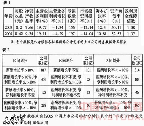 从表1的数据分析,2004年的整体业绩比2003年提高并不明显,在主营业务利润增长率、公司亏损数量、市场投资回报率、资本扩张率、资产负债率和盈利现金倍数这些指标方面表现2004年还不如2003年。2003年到2004年薪酬大幅度增长的公司为817家,占总样本的66.13%,这817家公司中净利润也大幅度增长的只有401家;净利润基本不变的公司有128家,占15.66%,净利润大幅度下降的有288家,占35.25%,薪酬变化不大的101家公司和薪酬大幅下降的314家公司中薪酬大幅增长的公司仍占131家,由上述数据来看,大部分公司的薪酬增长与业绩不是同方向变化。薪酬增长率和净利润增长率的相关性分析,结果相关系数只有0.096,呈弱相关性,由此看来,我国上市公司高层管理者的薪酬增长与业绩之间关系甚微,或者业绩不是导致薪酬增长的必然原因