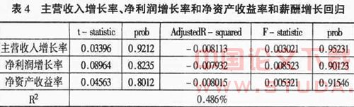 由表4可知,薪酬增长与主营收入增长率、净利润增长率和净资产收益率均不具有显著性增长,回归模型中的R2为0.486%,说明上述三个变量对薪酬增长的解释力较弱。