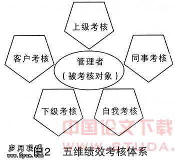 从上面的流程图可以看出,指标体系的建立显得尤为必要。建立指标体系需要从多方面着手,即建立一个多维的指标体系从而使考核结果更为公正和客观,理论界形象的把这一考评方式称之为360度绩效考核方式,它的基本思想是为被考核者(管理人员)提供自己如何被组织各个层面的人所认识和评价的信息,考核来自于同级、上级、下级、自我评价以及客户或服务对象,360度绩效考核力图从各个角度和层面去反映管理者工作的情况,从而使考核结果更为全面和可靠(如图2所示)。