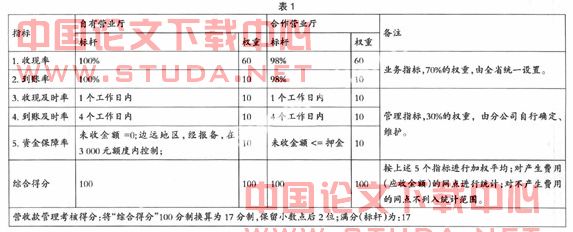 分公司营收款管理成效、控制责任纳入经营效绩考核中,这使相关管理者直接体验到监控责任的重要性。根据系统数据,只要月度营业收现率低于95%的,将直接扣减分公司领导薪酬。而在分公司财务工作月度考核评分(满分为100)方面,营收款管理工作单项考评占17分。这17分直接从系统取得。具体指标设置如表1。