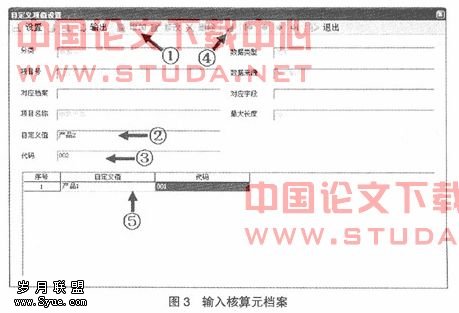 当完成对核算元的定义和操作设置后,在“自定义项类别”窗口的菜单中,点击“档案”菜单,进入核算元档案的输入窗口(图3)。按照下列步骤操作: