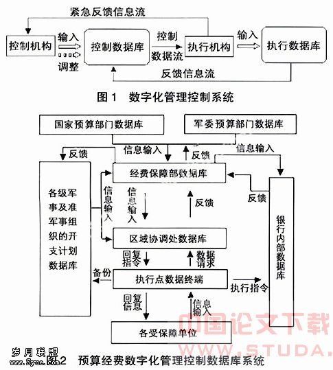首先,预算经费管理控制机构向控制数据库输入经费保障数据;然后,经费保障执行机构根据被保障单位的保障请求以及控制数据库的数据进行经费保障。同时,将保障结果输入执行数据库,对保障过程中的紧急事件可通过紧急反馈信息向控制机构反映。控制机构据此调整控制数据库;最后,控制数据库根据执行数据库的信息进行数据调整。