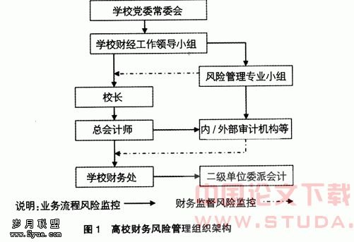 高校财务风险管理体系作为一项系统工程,必须设置合理的组织结构(如图1所示)来实施风险监控和风险管理活动,从业务流程和财务监督两个角度实现风险的控制和化解。具体来说体现在以下几个方面: