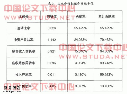通过表2可以看出,除应收账款周转率与销售收入增长率的相关系数的绝对值低于0.1外,其他指标均呈现线形相关。 (三)主成分特征值和贡献率值,见表3。