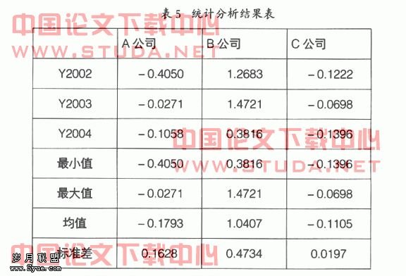 通过分析可以看出,A和C公司Y值均值都接近于0,但A公司2002年的Y值接近-0.5,2003和2004年相对较稳定。因此,Y的临界值应是Y≥0,而当Y≤-0.5时,公司处于财务风险警报区域。
