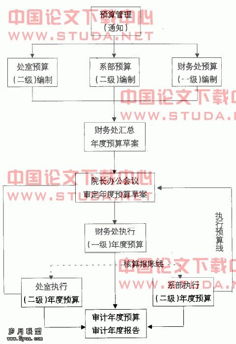 所谓预算管理体系是将内部预算管理分一、二级预算管理体系。一级属于院部,院部管理公共预算即公用经费、专项经费和基建经费。二级属于处室和系部,处室及系部管理人员经费即工资、奖金、福利、各项津贴等,审批权院级归院长及院长办公会议,处室及系部归各处室及系部第一负责人审批。在核算中设立一级、二级核算,一级核算归财务处核算,二级核算归财务处核算(各处室及系部设台账进行统计)。预算管理软件模块设置审批权限人,一级审批权归院长及院长办公会议,二级审批权归处室和系部第一负责人。