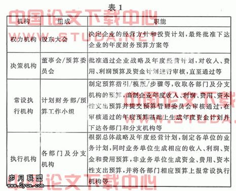 从组织机构的设立原则来讲,主要包括以下三点:①设定全面预算管理体系的多级架构,包括自上而下的权力机构、决策机构、常设执行机构和执行机构四级;②明确各级架构在全面预算管理体系中的定位和职责;③明确全面预算管理体系的主要控制点及审批权限。各机构的组成和职能如下(见表1):