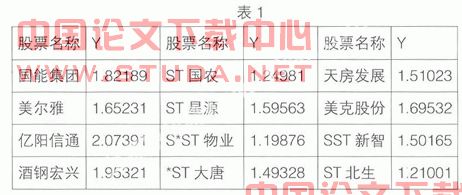 从表中Y值可以看出,对于正常,所有的Y值全部高于1.43,模型验证准确率为100%,而对于ST类的企业,只有50%的Y值是在1.43以下,另外50%Y值处于健康企业的范围,模型验证正确率为50%。