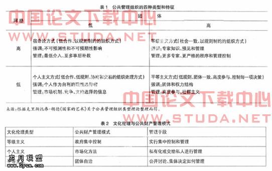 文化伦理组织类型的框架促使我们思考公共管理的多样性,而不是非此即彼的两分法那么简单。这里只考虑积极的公共管理模式,即将文化理论的三种积极模式对应于公共财产管理的三种模式和三种管理手段。每一种文化伦理决定的组织类型决定了公共财产管理模式的方向和手段。表2描述了三者之间的关系。