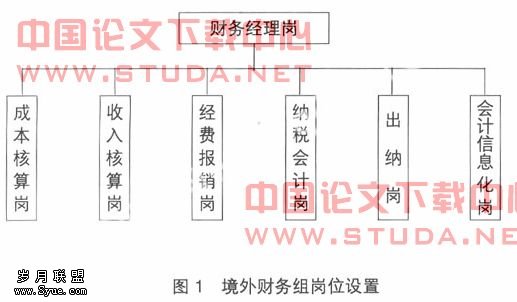 为充分发挥境外财务组的整体优势,切实履行集中管理境外财务工作的职能,结合境外业务实际情况,可以对财务组进行相应岗位设置,并且对每个岗位的职责进行明确的界定。如图1所示。