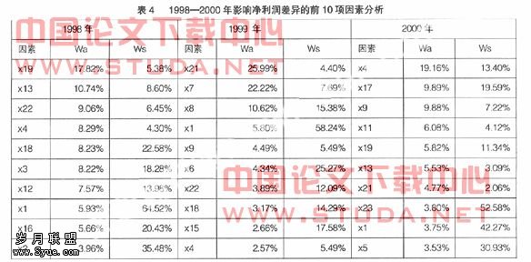 (1)在这些因素中,x1(呆账坏账准备)、x4 (固定资产减值准备)是影响差异的共同因素,不过每年的影响力和影响面却呈现不同的特征。x1(呆账坏账准备)在1998—2000年的影响力和影响面虽然呈现递减的特征,但影响极大,影响力依次为18.87%、16.82%和9.10%;影响面每年均在40%以上,1998年和1999年更是超过了50%,分别为64.52%和58.24%,位居各影响因素之首。x4(固定资产减值准备)却呈现波动的特征,在1998年的影响力为8.29%,但在1999年却急降到2.57%,而在2000年又高达19.16%;影响面却是每年呈递增趋势,由1998年的4.30%扩大到2000年的13.40%。