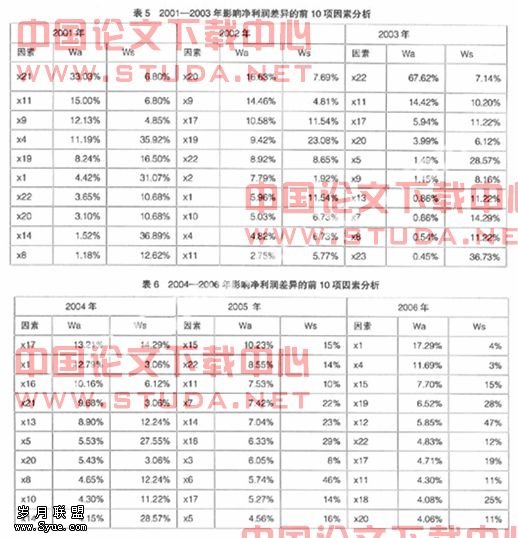 由下页表5和表6可以看出,2001—2006年前10项差异调整因素的影响力较大,通过比较,发现在这6年当中: