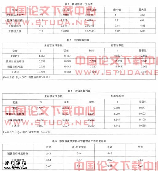 回到假设1,预算目标清晰性和预算难度的组合作用与工作满意度显著相关;模型(1)用于测试这个假设。其回归分析结果见表3。