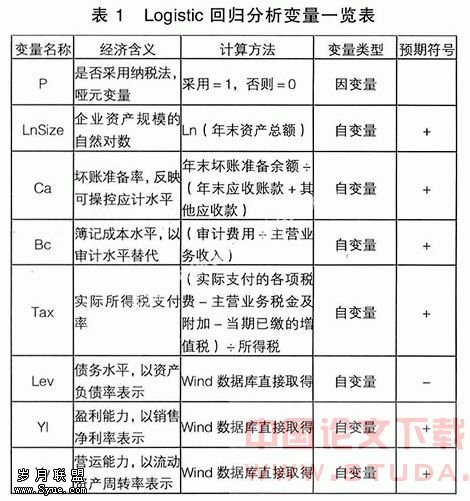 对于第二方面的六个假设,由于需要检验的是纳税法的选择与企业的哪些财务特征变量有关,因变量为是否选择纳税法的行为,是个二分变量,需要采用Logistic回归分析的方法进行检验。参照Logistic回归分析的一般模型,构建的分析模型为: