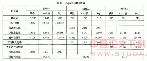 由上述结果来看,参与回归的七个自变量,回归结果均与预测符号一致,而且资产规模、资产负债率在1%、坏账准备率、流动资产周转率在5%水平下显著,但税负水平、审计费用占主营业务收入的比率、销售净利率不显著,但模型的判对率不是很理想,只有65%左右。