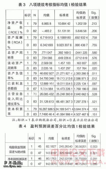 为了检验第一方面的假设,笔者将扣除6家金融企业后的27家纳税法公司与27家采用应付法的控制样本公司进行独立样本t检验。根据前述变量设计所确定的变量,笔者分别以工商类竞争性企业绩效评价指标中明确的8项基本指标和每股收益预测误差绝对值、净利润预测误差绝对值作为检验的变量,利用SPSS软件进行独立样本t检验,结果如表3。