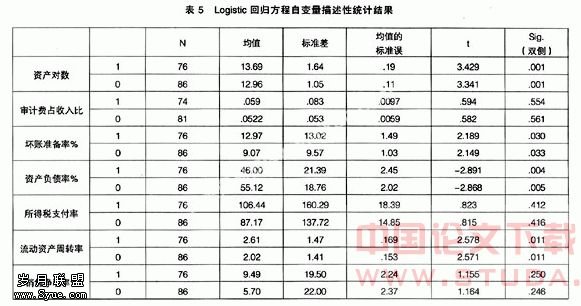 4.从Logistic回归分析结果来看,参与回归的7个自变量,回归结果均与预测符号一致,表明纳税法公司资产规模、坏账准备率、流动资产周转率、审计费用占主营业务收入的比率、实际支付的所得税占账面确认所得税的比率均成正相关关系,与资产负债率成负相关关系,与笔者的预计符号一致,但只有资产规模、资产负债率在1%、坏账准备率、流动资产周转率在5%水平下显著相关,税负水平、审计费用占主营业务收入的比率、销售净利率不显著。