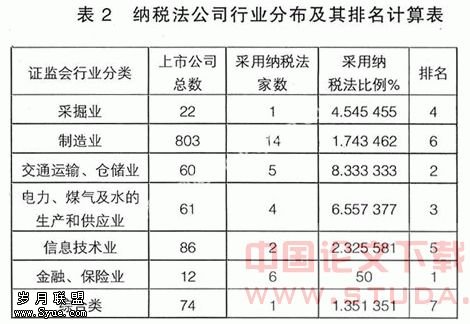 采用纳税法的公司占所在行业的上市公司数量的比例如表2。