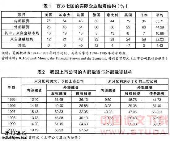 从下表可以看出我国企业的融资结构和西方发达国家的差异:西方发达国家的企业主要以内源融资为主,而我国企业的内源融资比重很小。在外部融资中,西方发达国家以债务融资为主,而我国以股权融资为主。我国很多上市公司在资产负债率相当低甚至接近于零的情况下仍然不放弃股权融资机会甚至还积极争取,这一现象称之为股权融资偏好。刘迎秋发现由于股权偏好,在上市的1000多家公司中,平均资金闲置达3.1亿元,个别资金闲置达38亿元,而很多有前景的小企业却资金缺乏,造成社会稀缺资源的极大浪费。股权融资偏好问题虽然是资本结构的问题,但是在我国渐进改革的特殊时期却暴露了很多深层次的矛盾。
