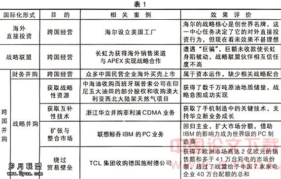 自20世纪90代中后期开始,在外资大量持续地流入中国的同时,中国企业也开始了积极的跨国经营探索。根据著名咨询公司罗兰·贝格公司针对国际化战略课题调查的50家中国领先企业的调研结果来看,中国领先企业进行海外经营是主要采取海外直接投资(绿地投资)、战略联盟、并购三种方式。中国企业对这三种模式的尝试案例及效果如表1所示。