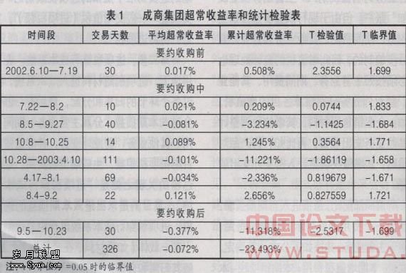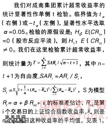 基于上述假设,我们以2001年1月2日至2002年7月19日的数据来拟合成商集团的市场模型,要约收购期间的数据不用来对市场模型的拟合,以消除假设2对市场模型的影响。我们选择收购发生前和发生后各30天的数据来分析要约收购对股票价格的真实影响,收购对目标公司股票价格的影响可用该股票价格在收购事件中的累计超常收益率来衡量。