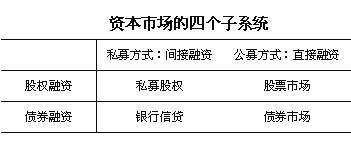 资本的基本形态有两种,一种是股权资本,另一种是债务资本。融资有两种基本的方式,一种是私募融资,另一种是公募融资。“私募”作为一种资本募集方式,是与“公募”相对应的概念。两两结合构成了四种融资模式组成了资本市场的四个子系统,如表: