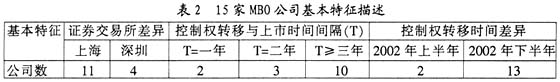 从表2可以看出:(1)实施MBO的上市公司主要来自上海证券交易所,有11家之多,这有可能是受上海活跃的环境所致;(2)控制权转移与上市时间间隔较长,有10家上市公司是在上市3年以后实施MBO,只有2家是在上市一年便实施MBO,这表明MBO多数发生在比较成熟稳定的上市公司中;(3)控制权转移时间主要集中在2002年下半年,有13家公司是在2002年下半年发生控制权转移,这可能受财政部和证监会在这一时期所出台的政策的影响,先后发布了停止执行《减持国有股筹集社会保障资金管理暂行办法》中关于利用证券市场减持国有股的规定,出台了《上市公司收购管理办法》等。通过考察我们还发现实施MBO公司的行业分布十分广泛,15家MBO公司分属石油、化学、电器机械及器材制造业等9个行业。