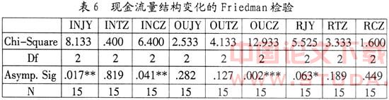 3.现金流量变化的统计检验。为了验证以上结论,本文采用多个相关样本检验法——Friedman法检验现金流量结构在MBO前后是否稳定。检验结果见表6。