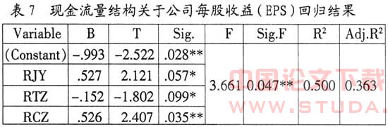 表7现金流量结构关于公司每股收益(EPS)回归结果