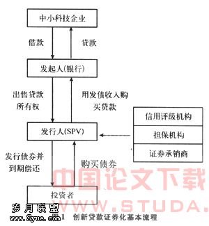 创新贷款证券化是资产证券化的一种模式,与一般模式相对应,创新贷款证券化的基本结构有原始债务人(科技)、发起人(银行)、发行人(SPV)和投资者组成。其过程就是银行将向中小科技企业提供的贷款(债权)真实出售给特设机构(special Put.pose Vehicle),SPV公司将其购买的贷款汇集成资产池(资产组合),再以该资产池所产生的现金流为支撑,在市场上发行债券融资,用发行债券所取得的收入购买银行的贷款所有权,最后用资产池所产生的现金流(企业的还款)来清偿所发行的债券。经过这样的操作,银行就可以将其不流通的创新贷款转换为真实现金流量,满足其对现金的现时需求,补足流动资金缺口,维持正常运作或进行新一轮的投资,扩大贷款规模,同时又为投资者提供新的投资渠道。